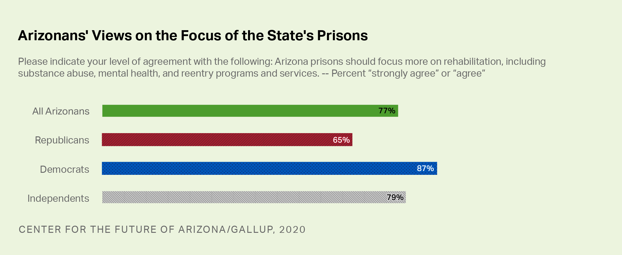One proposed change to the state's criminal justice system meets with strong support across the political spectrum. More than three-fourths of Arizonans overall (77%) agree that the state's prisons should focus more on rehabilitation, including substance abuse, mental health and reentry programs and services. While almost nine in 10 Democrats (87%) in the state support this idea, so do strong majorities of Republicans (65%) and independents (79%).