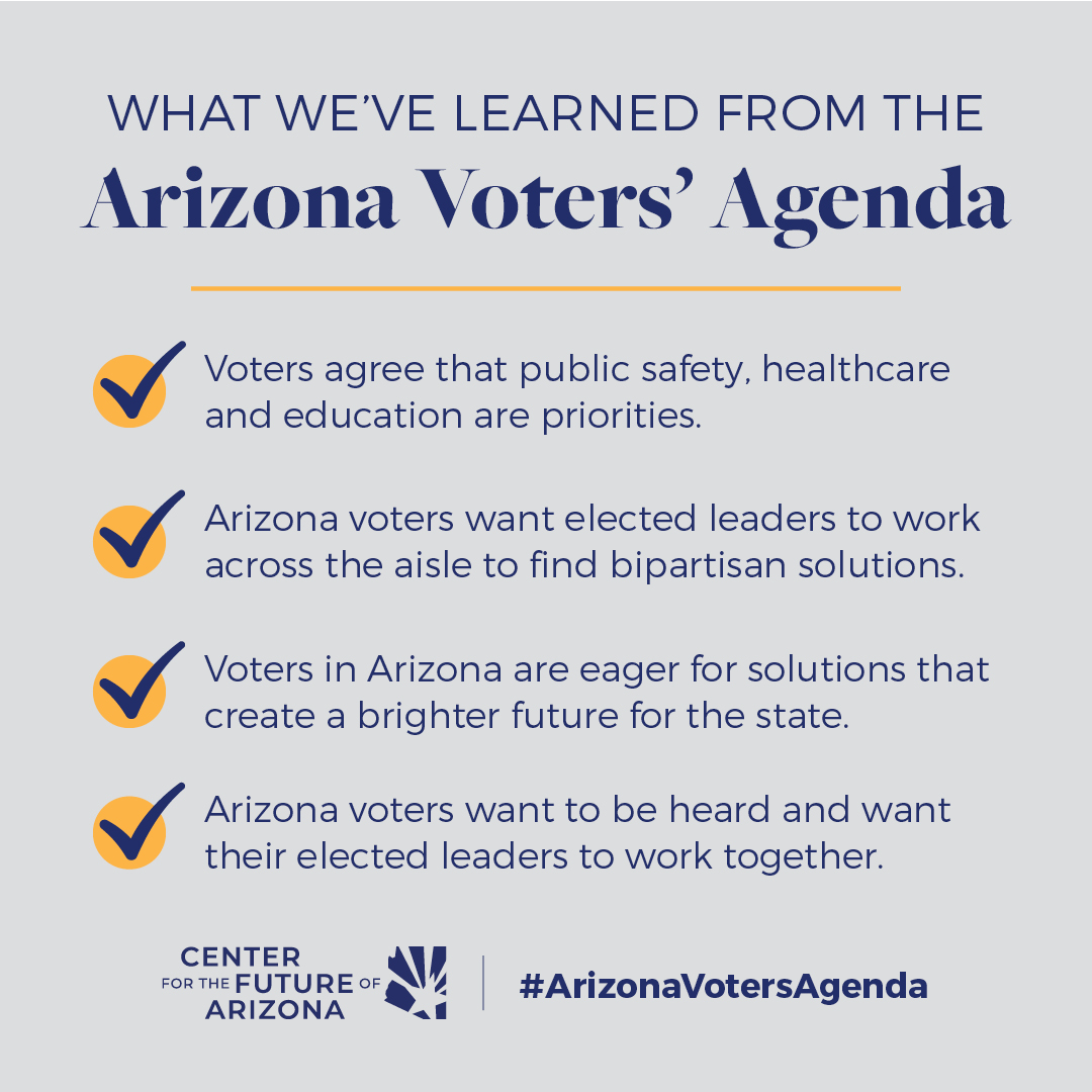 The Arizona Voters’ Agenda provides an action-oriented roadmap that remains relevant well beyond any one election cycle. Use the Arizona Voters' Agenda data and materials in your own conversations and decision-making. Grow your impact by sharing with your network. Your support is essential in spreading the word and delivering on voters' shared priorities. Browse & download materials below.